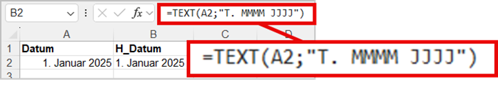 Die Formel =TEXT(A2;“T. MMMM JJJJ“) gestaltet die Anzeige eines Datums in Excel. Das „T“ steht für den Tag und sorgt dafür, dass einstellige Tage auch nur eine Ziffer haben. Nach dem Tag folgen ein Punkt und ein Leerzeichen. Vier große „M“ schreiben den Namen des Monats aus und vier große „J“ zeigen das Jahr mit vier Ziffern.