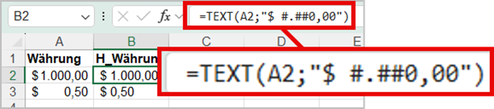 In diesem Beispiel wird als Währung der Dollar benötigt. Daher ist folgende Formel zu erzeugen: